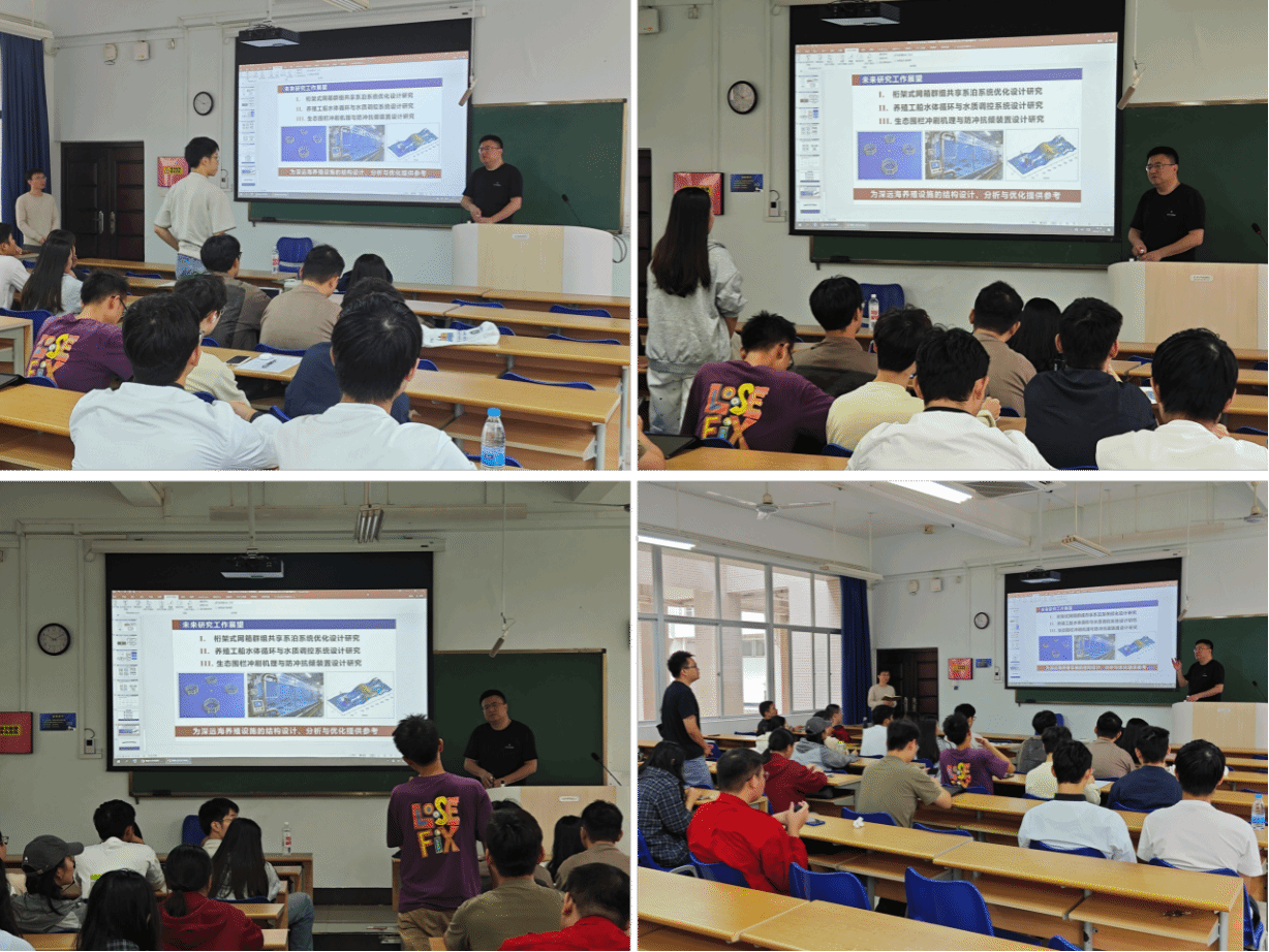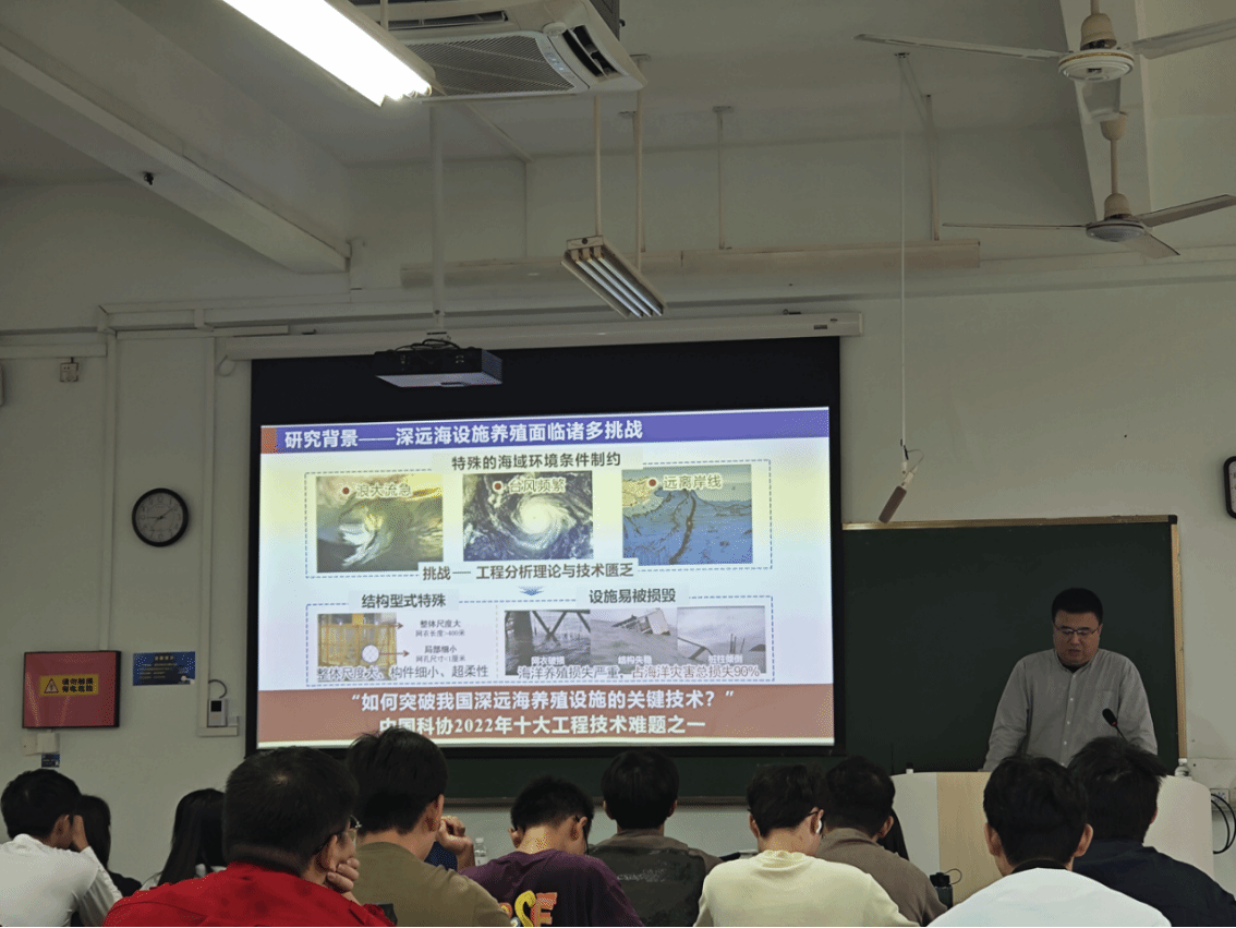 首日讲座,赵云鹏教授以向海洋要食物的国家战略为引,为同学们描绘了海洋资源开发利用的广阔前景。海洋作为潜力巨大的蓝色粮仓,其现代海洋牧场建设是推动渔业转型升级、实现高质量发展的重要突破口。在此背景下,他带领同学们深入剖析了桁架式网箱这一核心装备,细致讲解了其水动力特性、结构稳性与强度,并进行了成本效益评估,清晰地勾勒出科技创新驱动产业发展的完整链条。