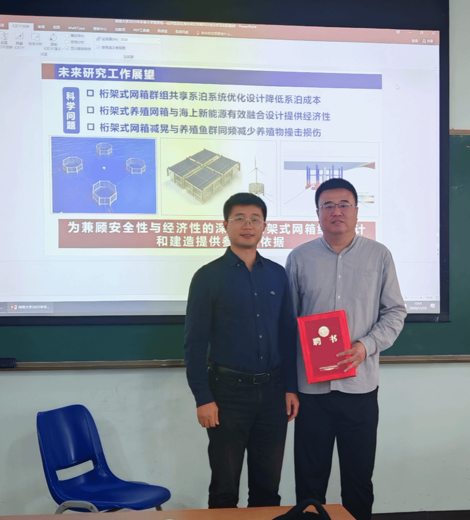 2025111516,大连理工大学赵云鹏教授应邀为公司开展为期两天的《深远海养殖关键装备水动力特性研究与技术创新》专题讲座讲座在太阳成集团tyc234cc海甸校区4号教学楼105教室举行开班仪式由公司副经理任年鑫教授(首日)与郑振钧副研究员(次日)共同主持。任年鑫副经理代表公司对赵云鹏教授表示热烈欢迎,并现场颁发了专家聘书。本次活动吸引了校内师生及海南本地企业代表的积极参与。