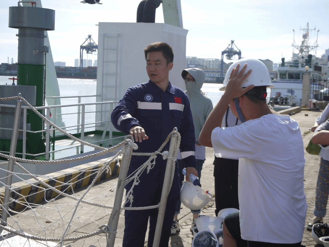 在海口海洋地质调查中心船舶大队队长陈亚东、“海洋地质二十六号”科考船大副匡载芳和工程师刘雨飞等工作人员的组织下,同学们有序入场。参观过程中,员工们认真听取了大副匡载芳对科考船的详细介绍,仔细观察了船上的指挥舱、仪器设备区等关键区域,对科考船的构造与功能有了直观的认识。讲解员表示:“同学们今天状态很好,求知热情高涨。”此次活动加深了员工对海洋科研活动的认知,开阔了视野,增强他们对海洋科学探索和研究的兴趣。