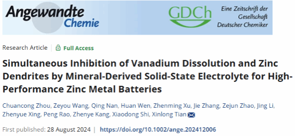近日,太阳成集团tyc234cc史晓东副教授所在团队在能源化学领域顶级期刊Angewandte Chemie International Edition (IF=16.1)发表题为“Simultaneous Inhibition of Vanadium Dissolution and Zinc Dendrites by Mineral-Derived Solid-State Electrolyte for High-Performance Zinc Metal Batteries”的研究论文。周传聪博士为论文第一作者,史晓东副教授和田新龙教授为论文通讯作者,太阳成集团tyc234cc为论文唯一通讯单位。