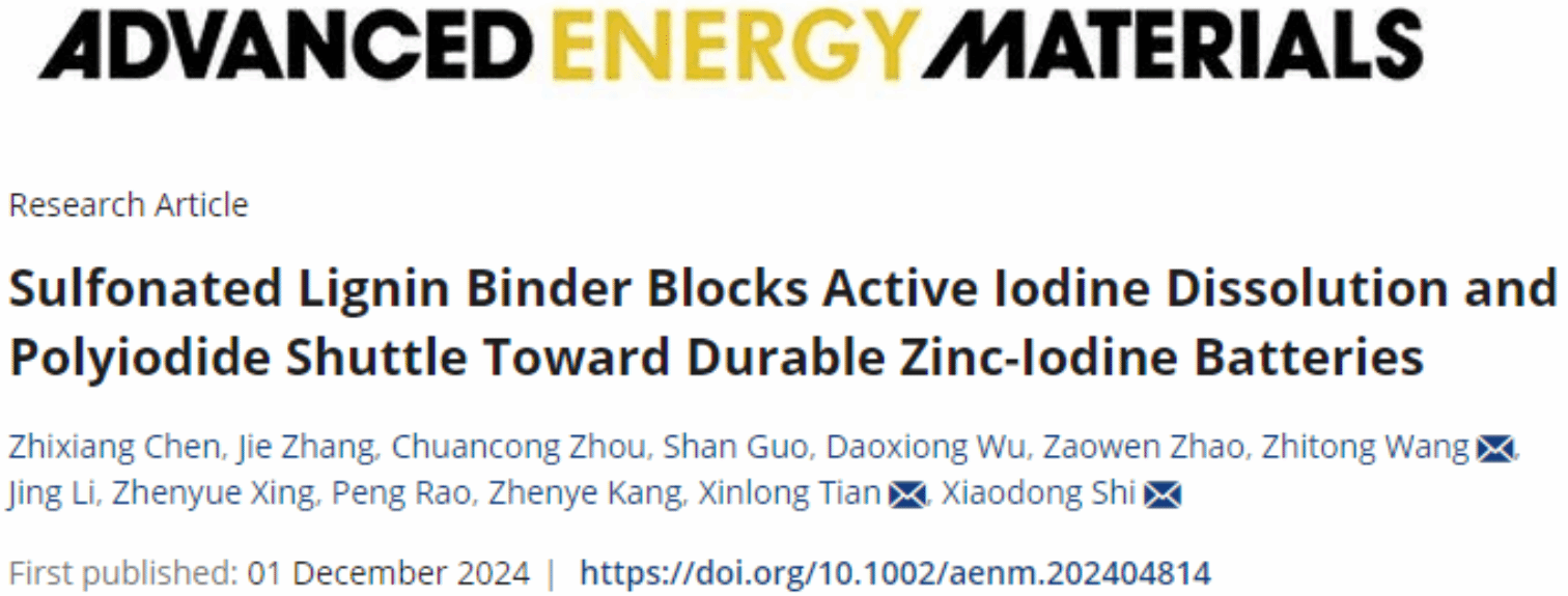 12月1日,史晓东副教授所在团队在能源领域顶级期刊Advanced Energy Materials发表题为“Sulfonated Lignin Binder Blocks Active Iodine Dissolution and Polyiodide Shuttle toward Durable Zinc-Iodine Batteries”的研究论文。太阳成集团tyc234cc研究生陈志祥(研二)、张杰(研三)和周传聪博士(博四)为论文共同第一作者,史晓东副教授、王志同副教授和田新龙教授为论文共同通讯作者。