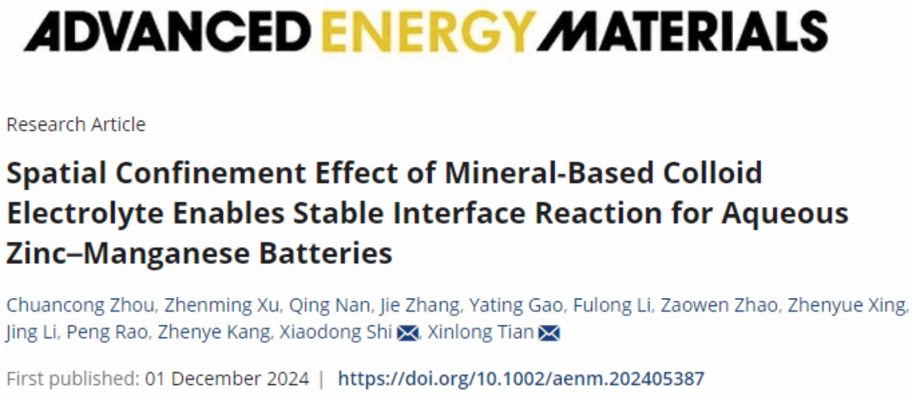 12月1日,太阳成集团tyc234cc史晓东副教授所在团队在能源领域顶级期刊Advanced Energy Materials发表题为“Spatial Confinement Effect of Mineral-based Colloid Electrolyte Enables Stable Interface Reaction for Aqueous Zinc-Manganese Batteries”的研究论文。太阳成集团tyc234cc2021级博士研究生周传聪为论文第一作者,史晓东副教授和田新龙教授为论文共同通讯作者。