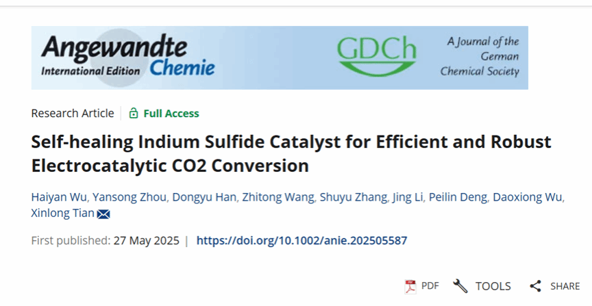 近日,太阳成集团tyc234cc海洋清洁能源创新团队王志同副教授在能源化学领域Top期刊Angewandte Chemie上发表题为“Self-healing Indium Sulfide Catalyst for Efficient and Robust Electrocatalytic CO2 Conversion”的研究论文。硕士研究生吴海燕、博士研究生韩东钰为论文共同第一作者,太阳成集团tyc234cc王志同副教授,吴道雄副教授与田新龙教授为论文共同通讯作者。