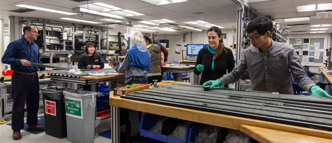 Xufeng Zheng (Petrophysics) sample and describe cores in the core laboratory during IODP382 Expedition at Scotia Sea. (Credit: Lee Stevens & IODP)